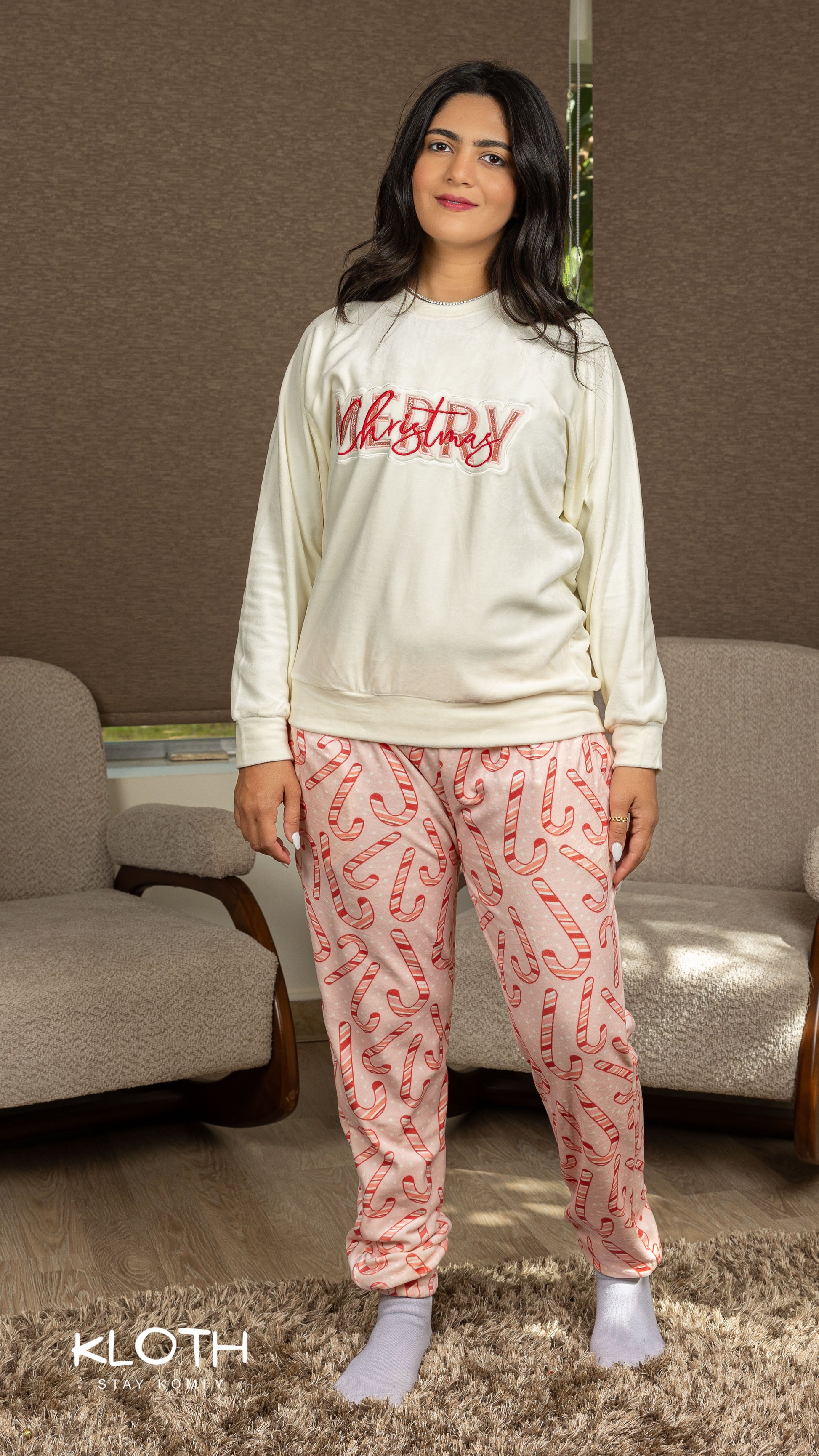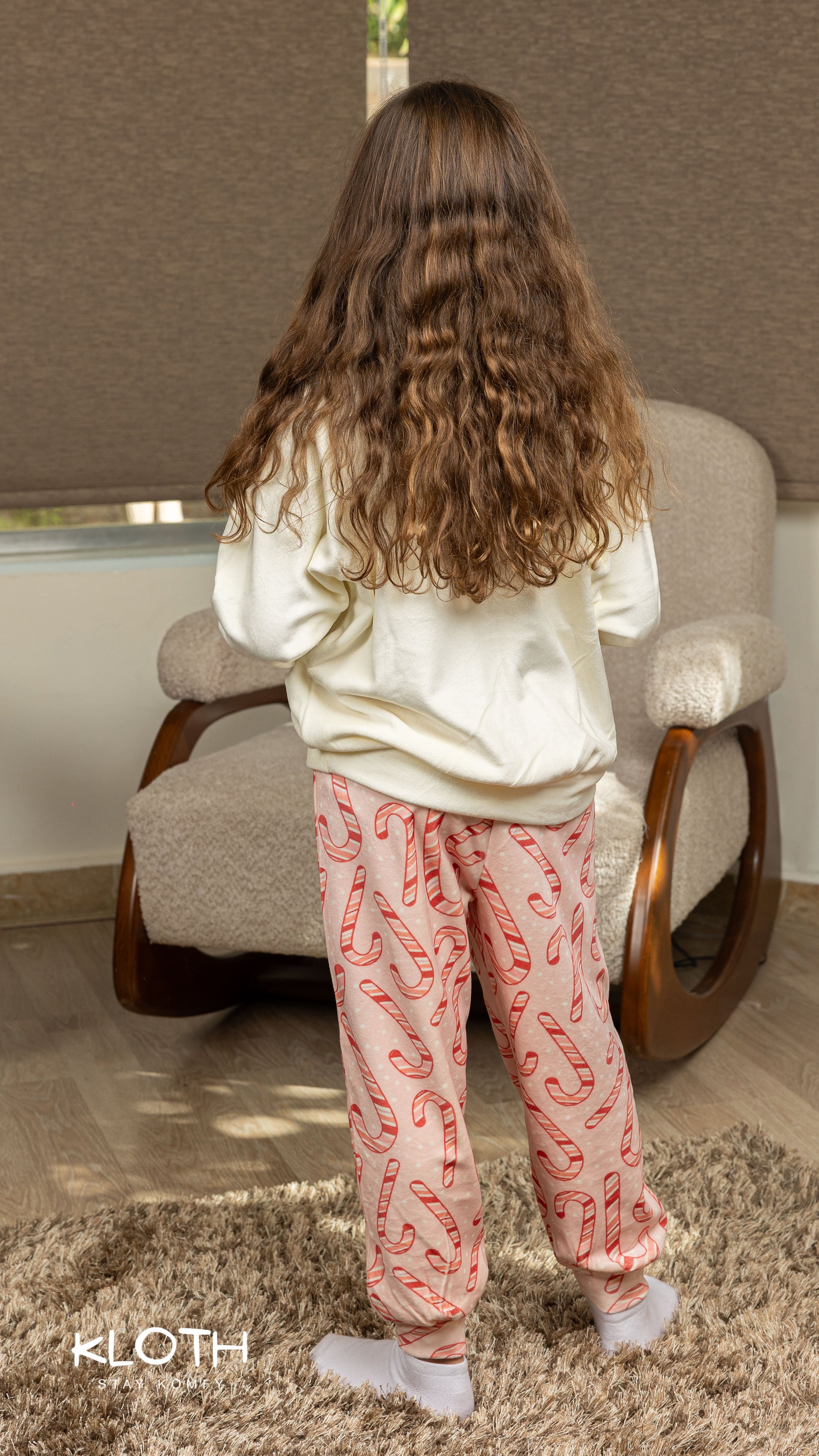 This cozy set features a soft cream crewneck top with a bold red “Merry Christmas” print, paired with adorable pink candy-cane printed pants that add the perfect touch of holiday sweetness.